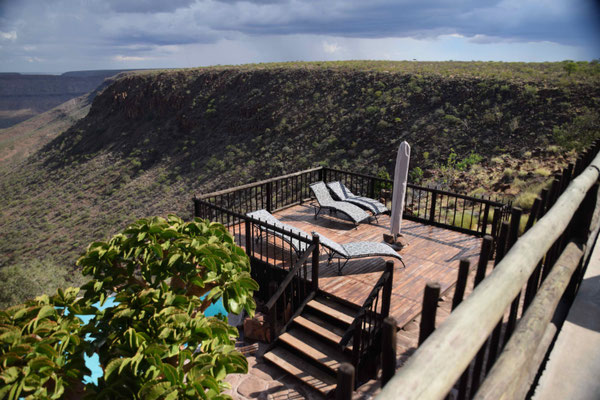 Nach einer abenteuerlichen Fahrt in die Berge ging es erst einmal zum Entspannen auf die Terrasse der Grootberg Lodge mit einem fantastischen Ausblick. Typisch deutsch kamen wir - fast pünktlich zu