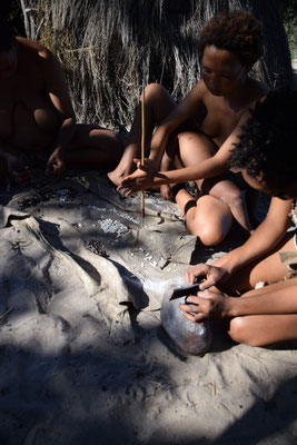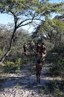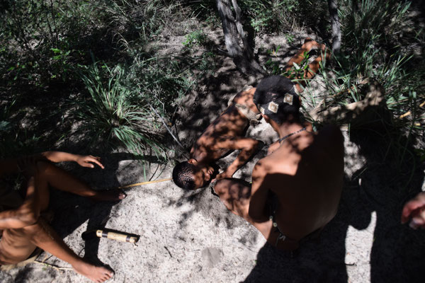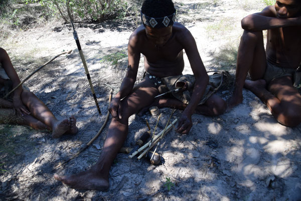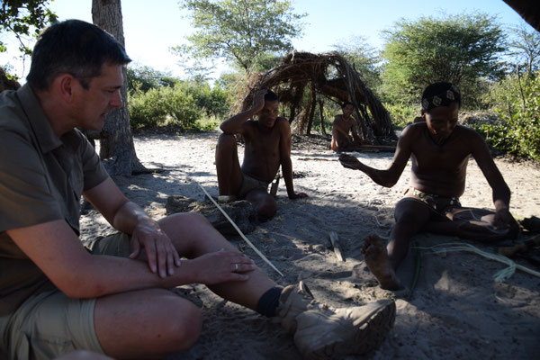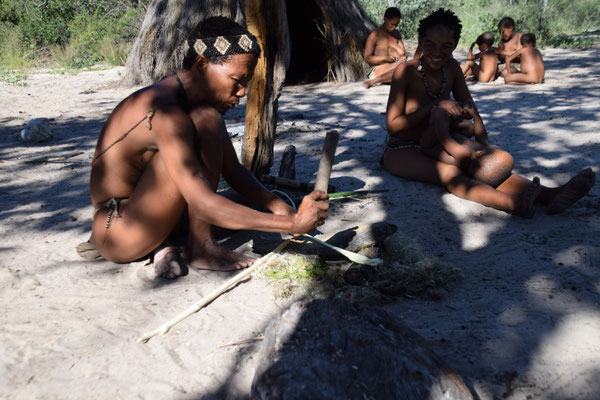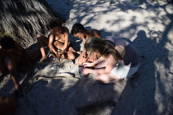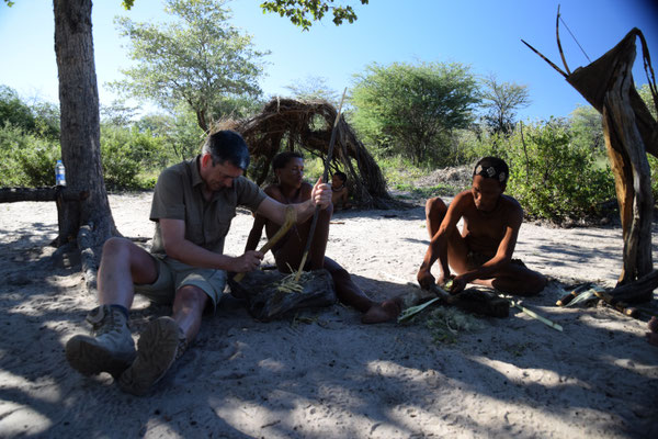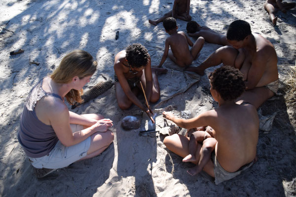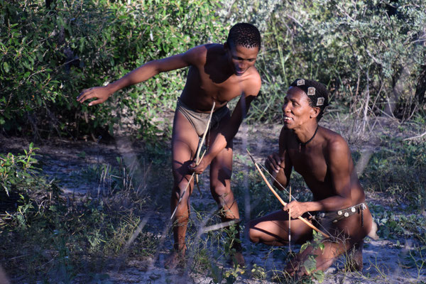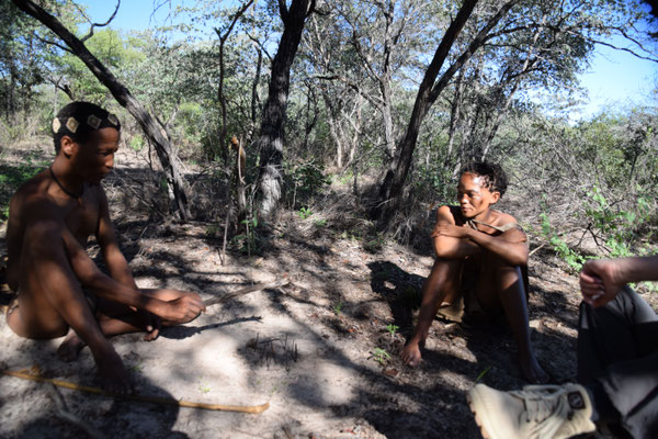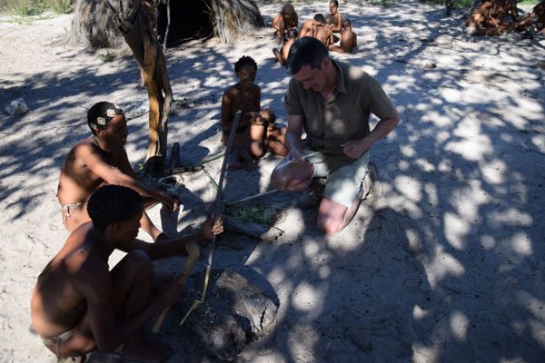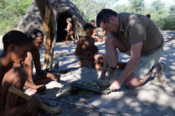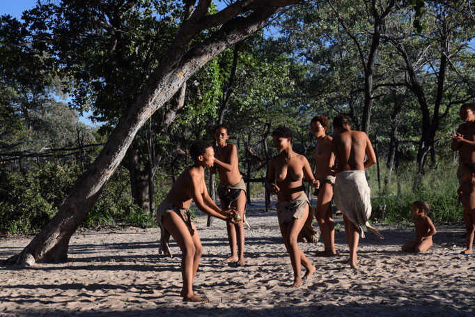 Ein beeindruckender Tag mit den San und ein überraschend tiefer Einblick in ihre alte Kultur und den Spagat, den sie heute bewältigen müssen, gib zu Ende mit dem Monkey-Orange Spiel und dem Regentanz.