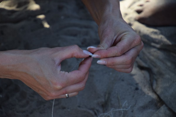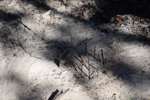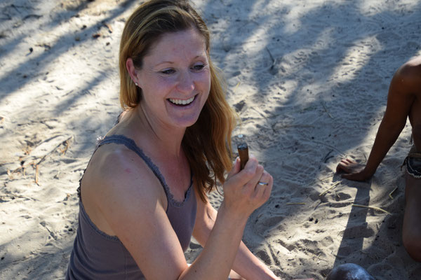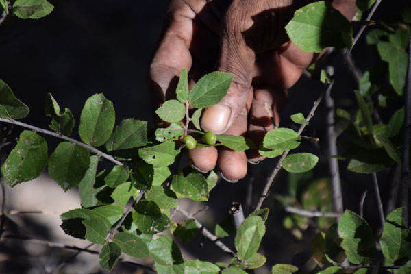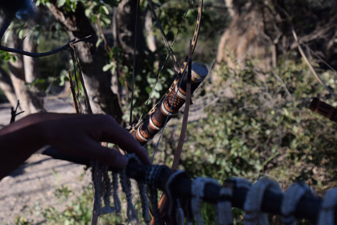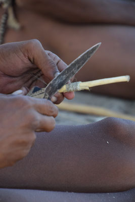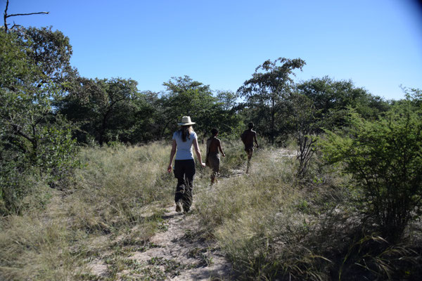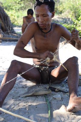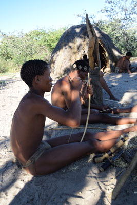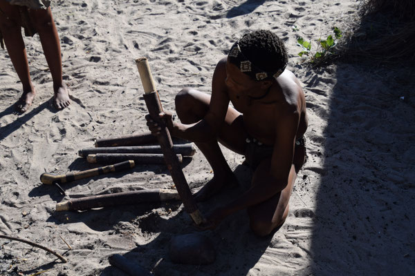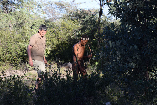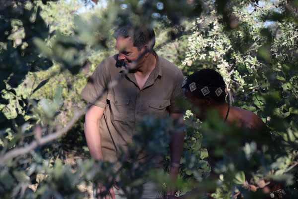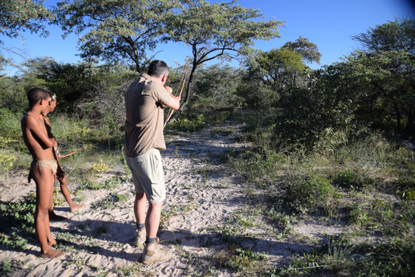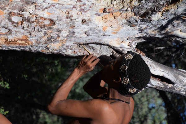 3,5 Stunden ging es durch den Bush mit Erklärungen zu Heilpflanzen und dem Leben vor dem Jagdverbot für die Einheimischen hier im San Gebiet. Vogel-Fallen und wie man Wasser in Bäumen finden kann, wurde uns erklärt und, dass ein Jäger alles was er benötigt, in seinem Köcher immer dabei hat. Pfeile, Holz zum Feuer machen und auch 2 Strohhalme...