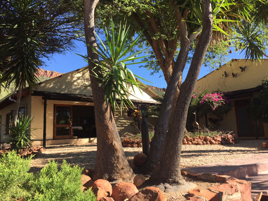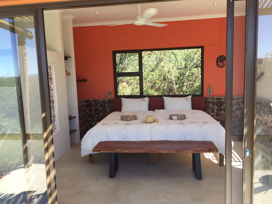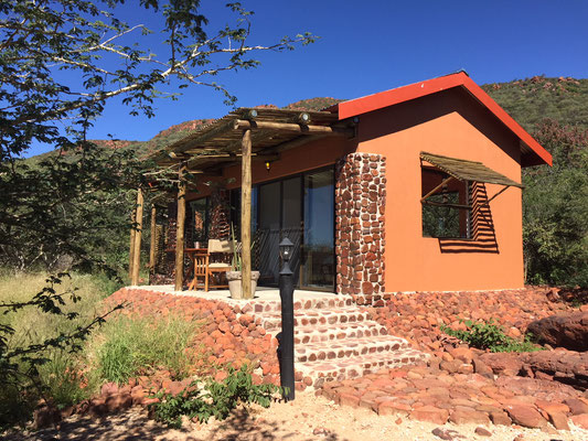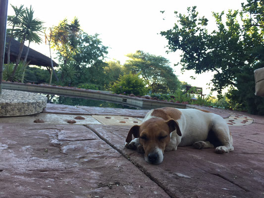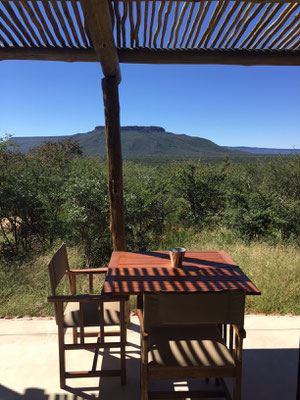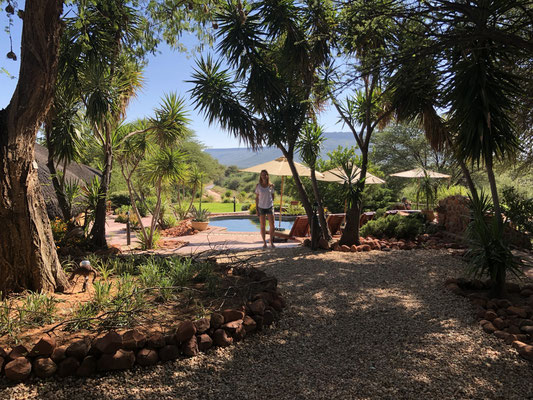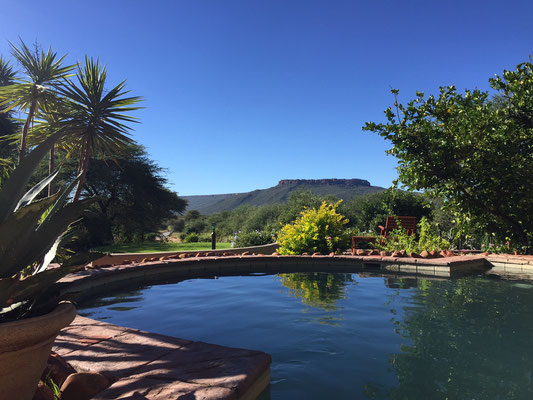 Unser Quartier in Bungalow 7, dem letzten und höchst gelegenen Bungalow genossen wir erst einmal ein entspanntes Savanna und ein Bierchen, bevor wir uns dem Blick auf den großen Waterberg vom Pool aus widmeten. Begleitet wurden wir von Mia der kleinen Terrierhündi und gelegentlich von Oscar - im Gegensatz zu Mia ein grooooßer Rhodesien Ridgeback.