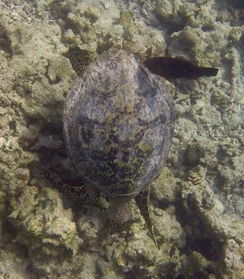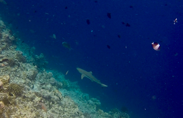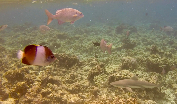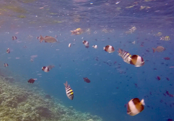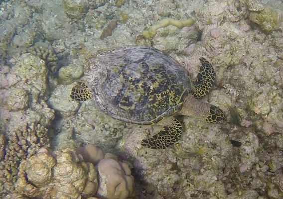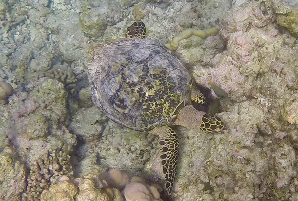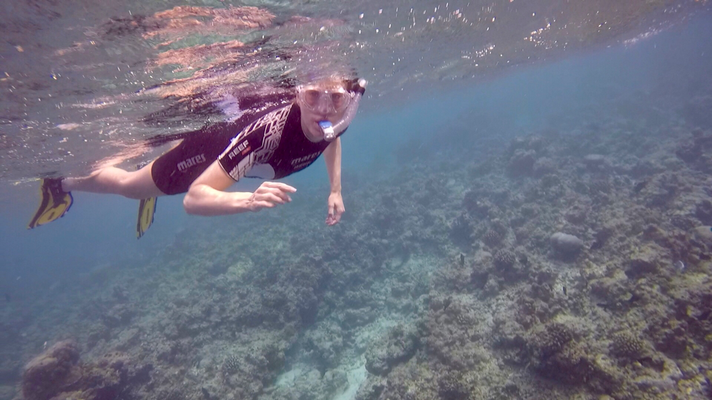 Genial ist das Hausriff, dass leider nicht ganz um die Insel beschnorchelt werden kann. Am Östlichen Ende der Insel ist die Strömung so stark, dass man hier nicht Schwimmen oder Schnorcheln soll.