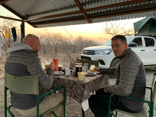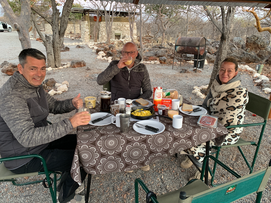 Erste Etappe ist aber der Spar Markt in Otjiwarongo wo wir alles kaufen was Mann zum Zelten so braucht. Mit Fleisch und Bier kommen wir Männer also zurück und verstehen das Wort „Beilagen“ irgendwie nicht. Gut, dass wir noch warme Decken für die doch kalten Nächte mitgebracht haben. Unsere Rettung im doppeltem Sinne!