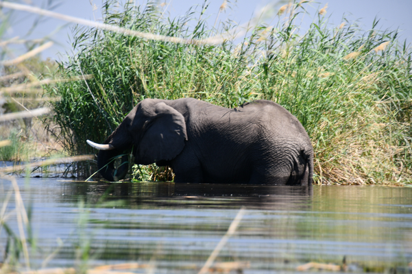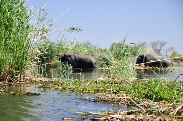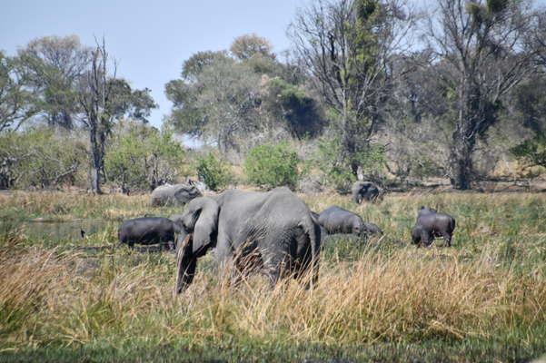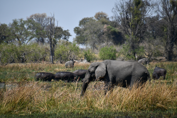 Wir sind schon auf dem Weg zurück von der Insel da dürfen wir noch 2 aufregende Situationen erleben. Zunächst eine große Herde Hippos die aufgeschreckt ins Wasser flüchtet und dann 3 Elefanten die