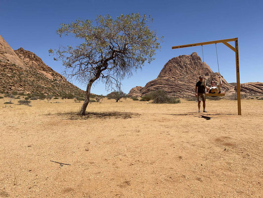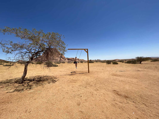 Die Lodge ist schon der Hammer. Sie wirkt wie in den Berg gearbeitet und bietet ein einzigartiges Ambiente. Ob es das Geld wert ist, muss jeder selber entscheiden. Für uns ist es der perfekt Start in das Abenteuer- auch mit der Schaukel auf dem Weg zur Lodge…sehr witzige Idee!