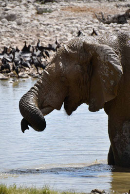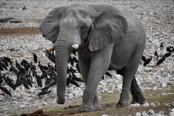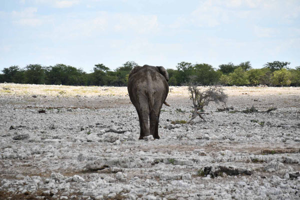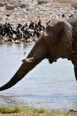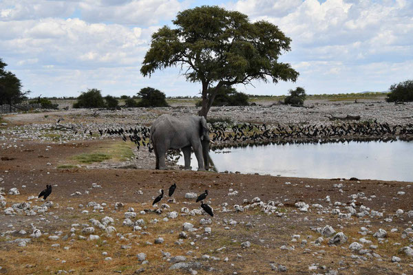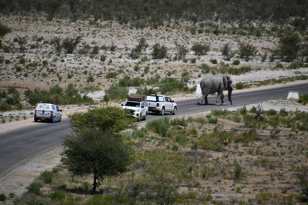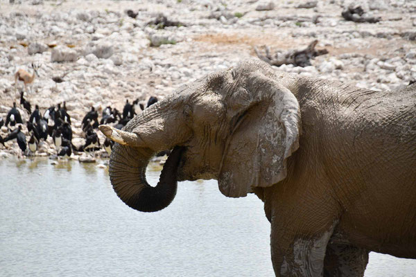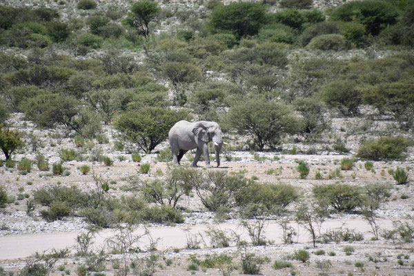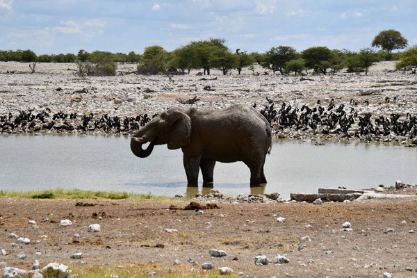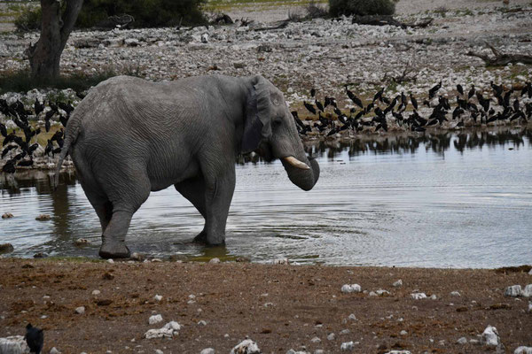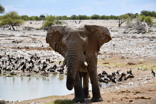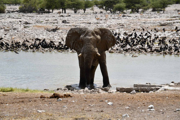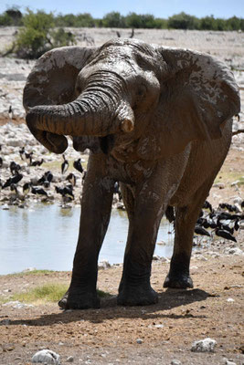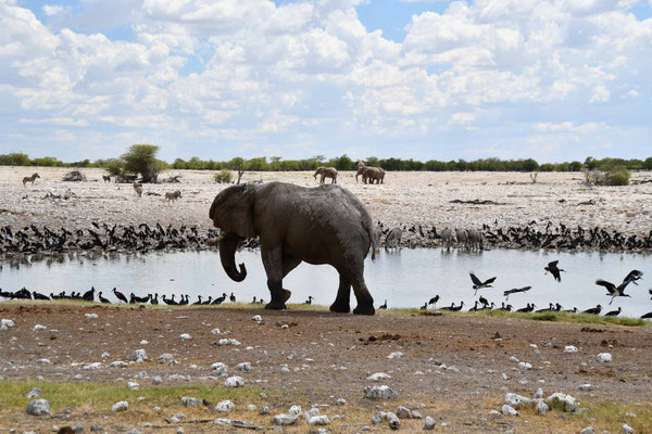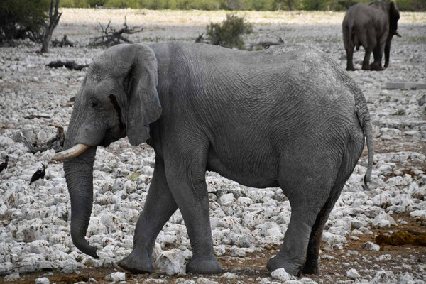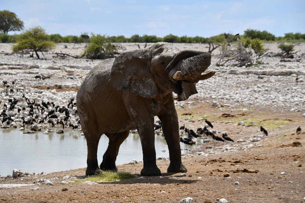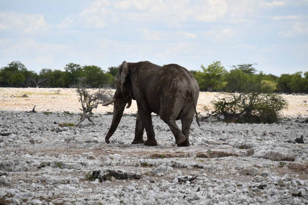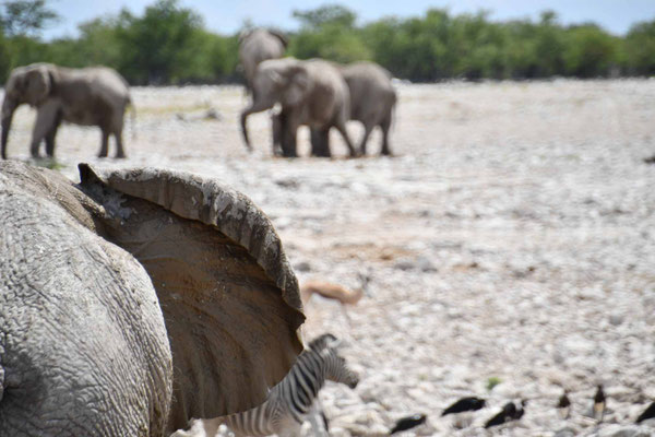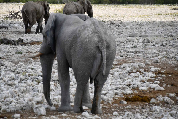 Der Elefant war dann tatsächlich schneller am Wasserloch und hat 4 andere Elefanten kurzerhand verscheucht. An den dunklen Flecken zwischen den Augen und den Ohren, kann man auch erkennen warum. Der Große ist in der Mast!