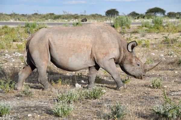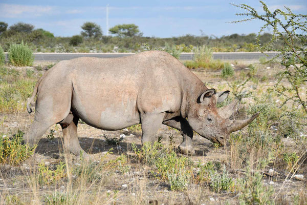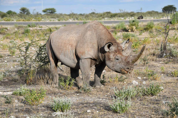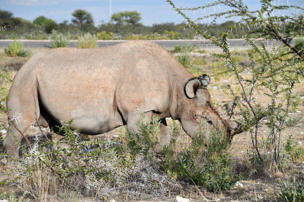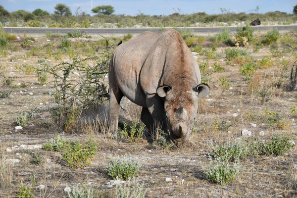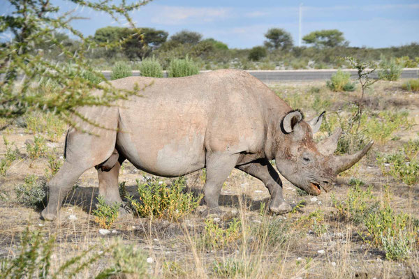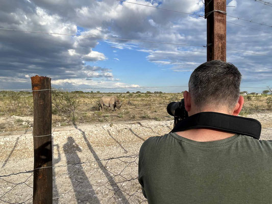Das war doch schon nicht schlecht, dachten wir und wollten gerade das Zelt aufbauen, bis einer der Platzwärter zu uns kam und nur Rhino sagte und in Richtung Zaun zeigte. Also alles stehen und liegen gelassen, Kamera geschnappt und losgerannt!
