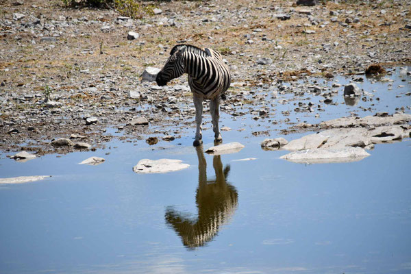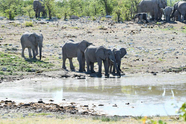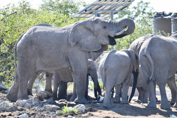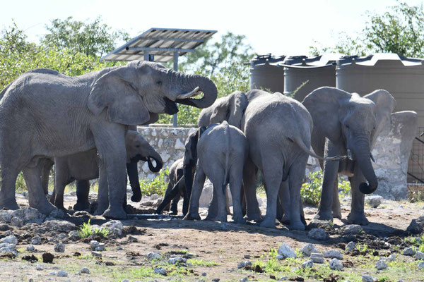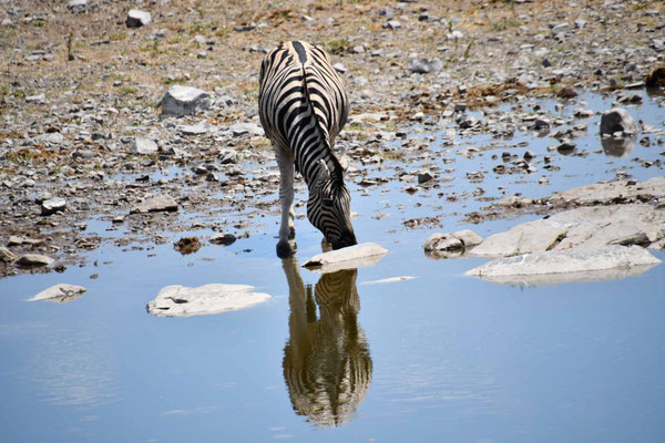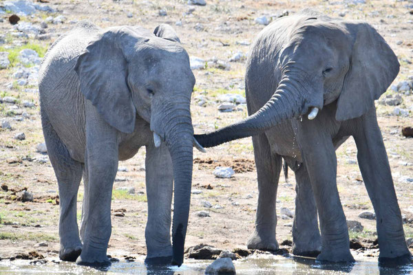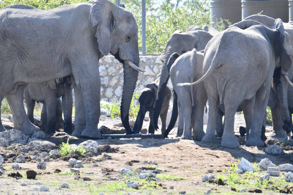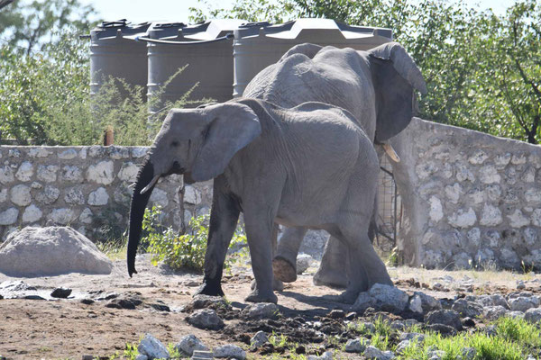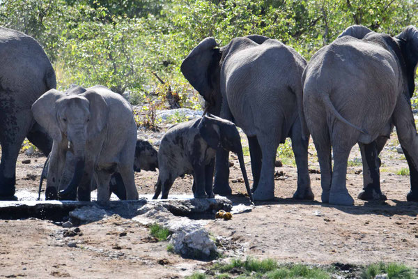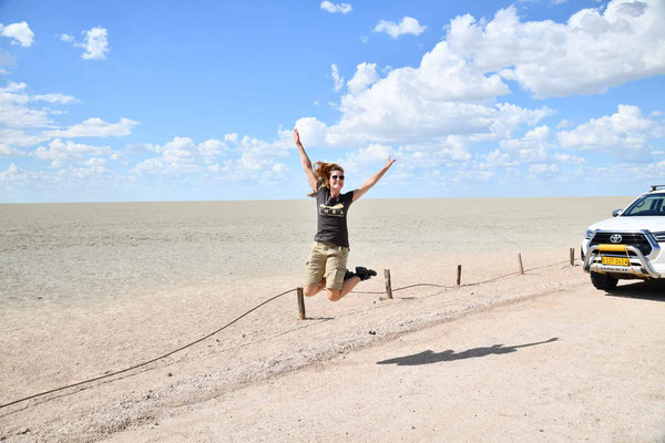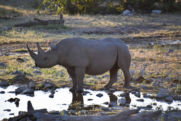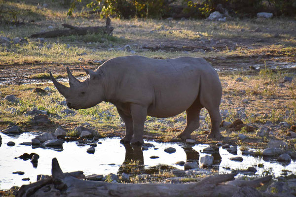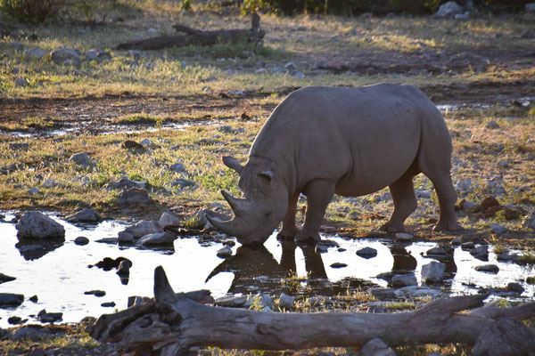 Nach ein paar verrückten Bilder in der Salz-Pfanne, haben wir dann noch ein Bierchen am Wasserloch in Halali geschlürft. Schlürfen durfte auch das Nashorn und die Schildkröten!