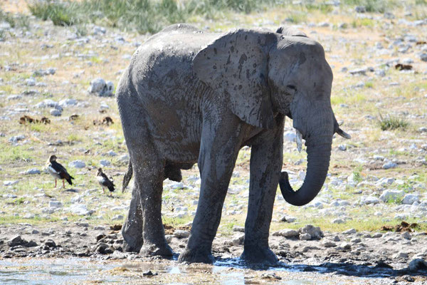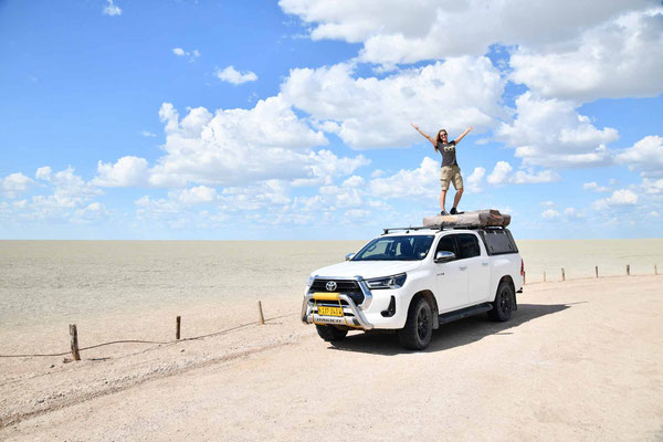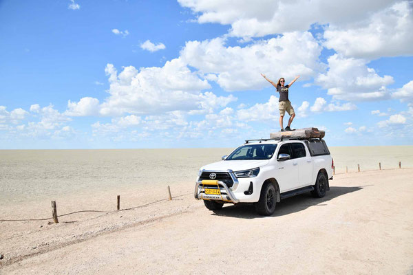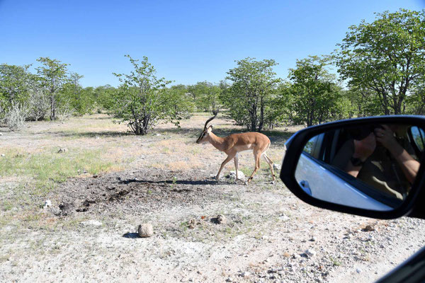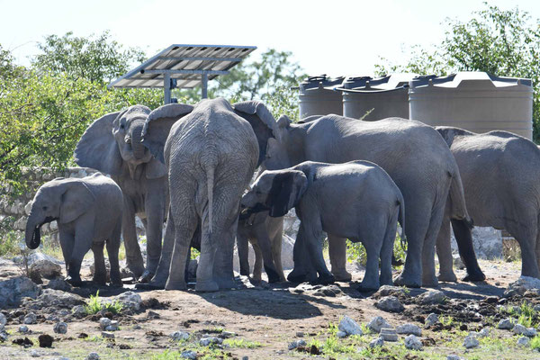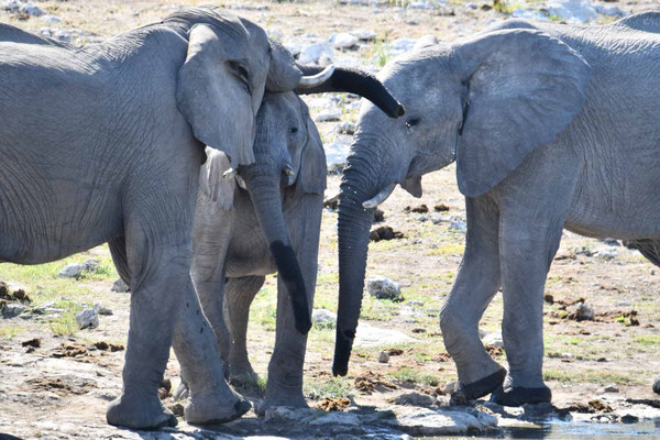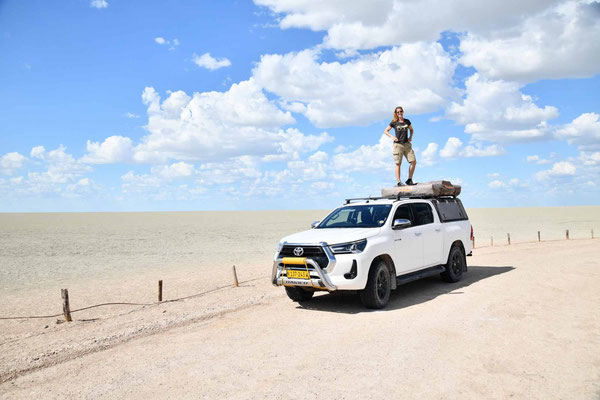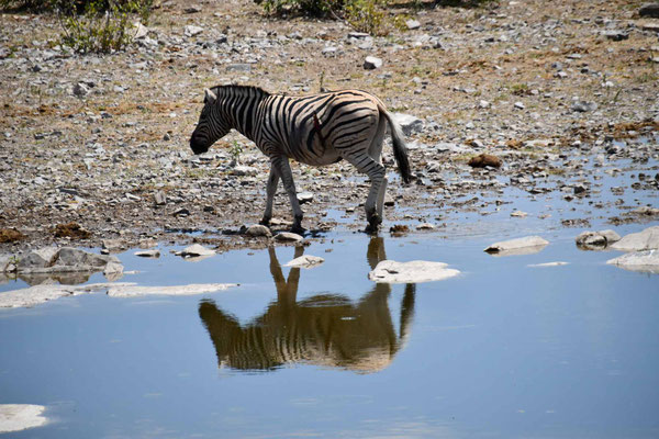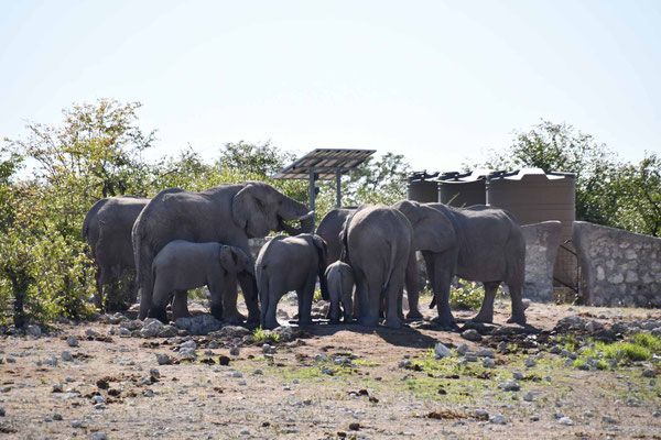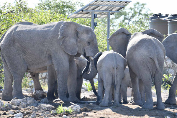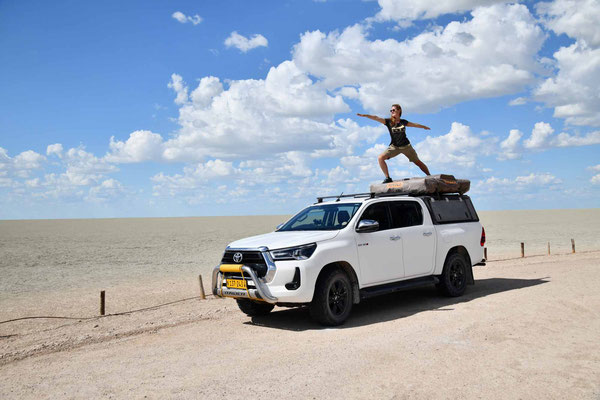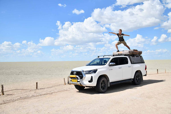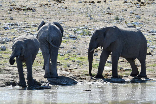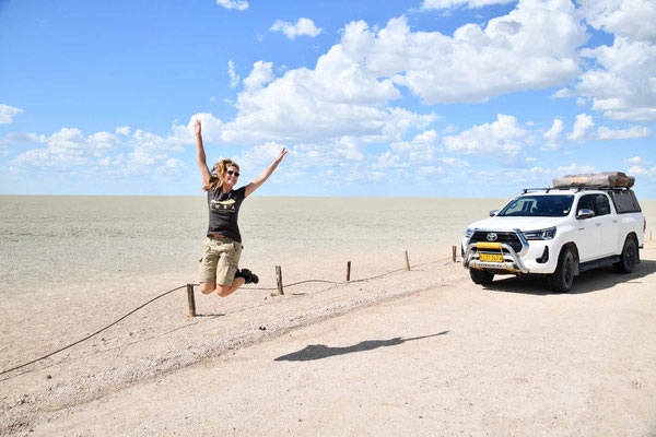 Nach ein paar verrückten Bilder in der Salz-Pfanne, haben wir dann noch ein Bierchen am Wasserloch in Halali geschlürft. Schlürfen durfte auch das Nashorn und die Schildkröten!