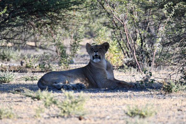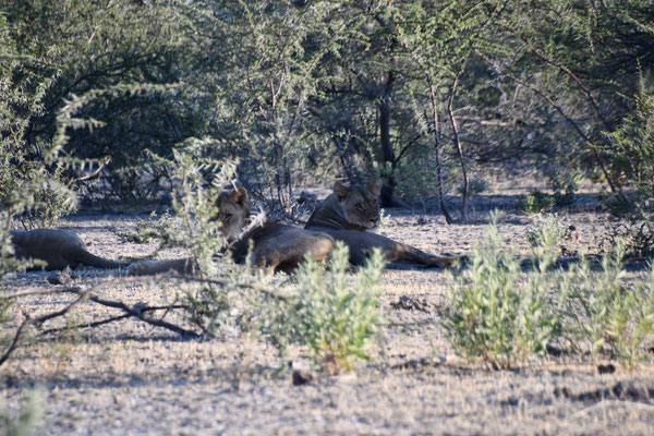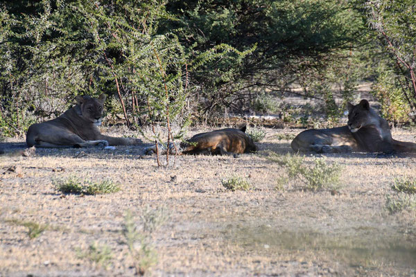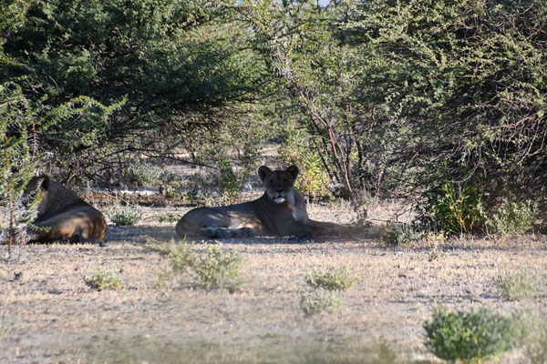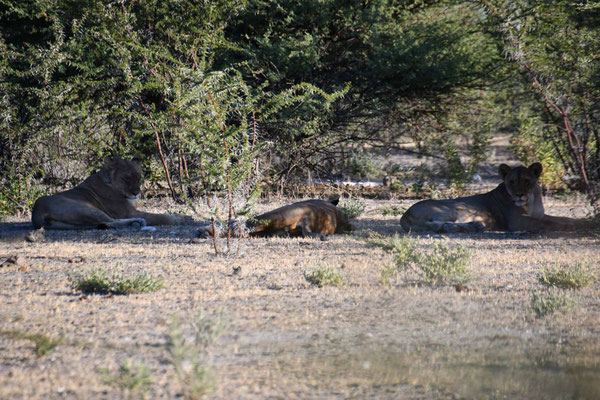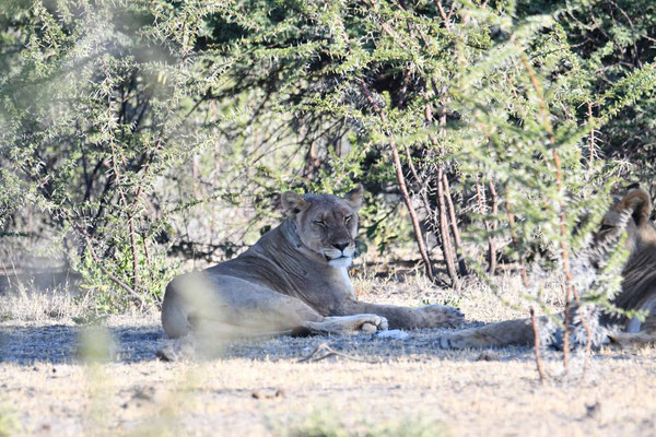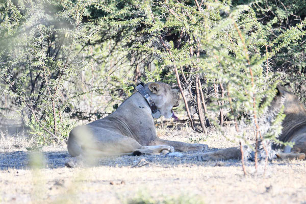 Diese Pirsch fing unerwartet erfolgreich an. Schon wenige Kilometer entfernt stießen wir auf ein Löwenrudel, von denen wir 3 Ladys bewundern durften. Eine der Damen trägt einen Tracker. Damit hat die vermutliche 1. Lady immer auf dem Schirm und weiß gleichzeitig wo das Rudel ist.