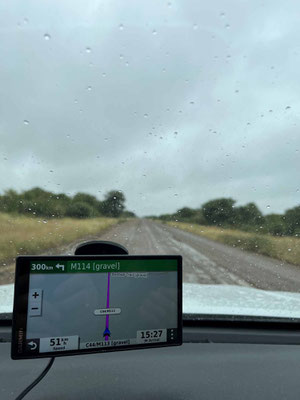 Das Navi hat uns nach 300km das erste Mal angeboten abzubiegen. Also verfahren konnten wir uns nicht. Dennoch war es sehr rutschig auf dem nassen Sand und sehr anstrengend sich zu konzentrieren. Wir haben uns immer abgewechselt und mit einem Hörbuch bei Laune gehalten.
